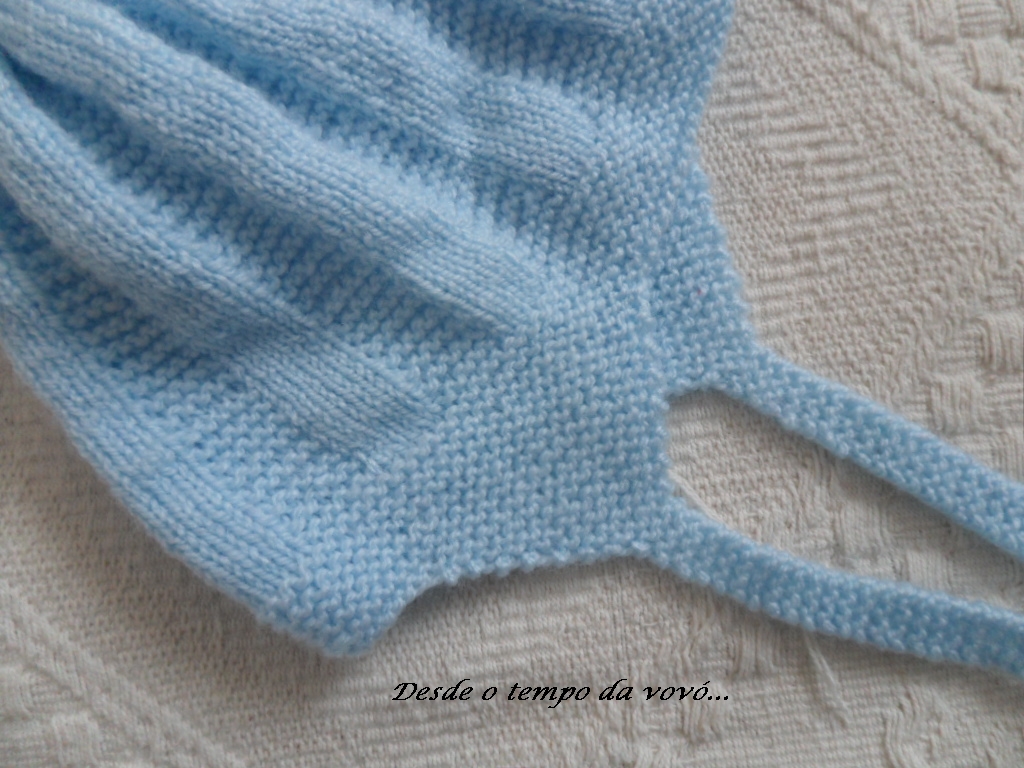 Depois de costurado, na parte correspondente ao pescoço, montar os pontos e fazer 4 carreiras (2 cordões) em tricô, 1 carreira de passa fita (*2 pontos juntos em tricô, 1 laçada, 1 tricô* ; repetir de * a * até o final da carreira) 4 carreiras (2 cordões) em tricô , arremate e passe a fita de cetim.